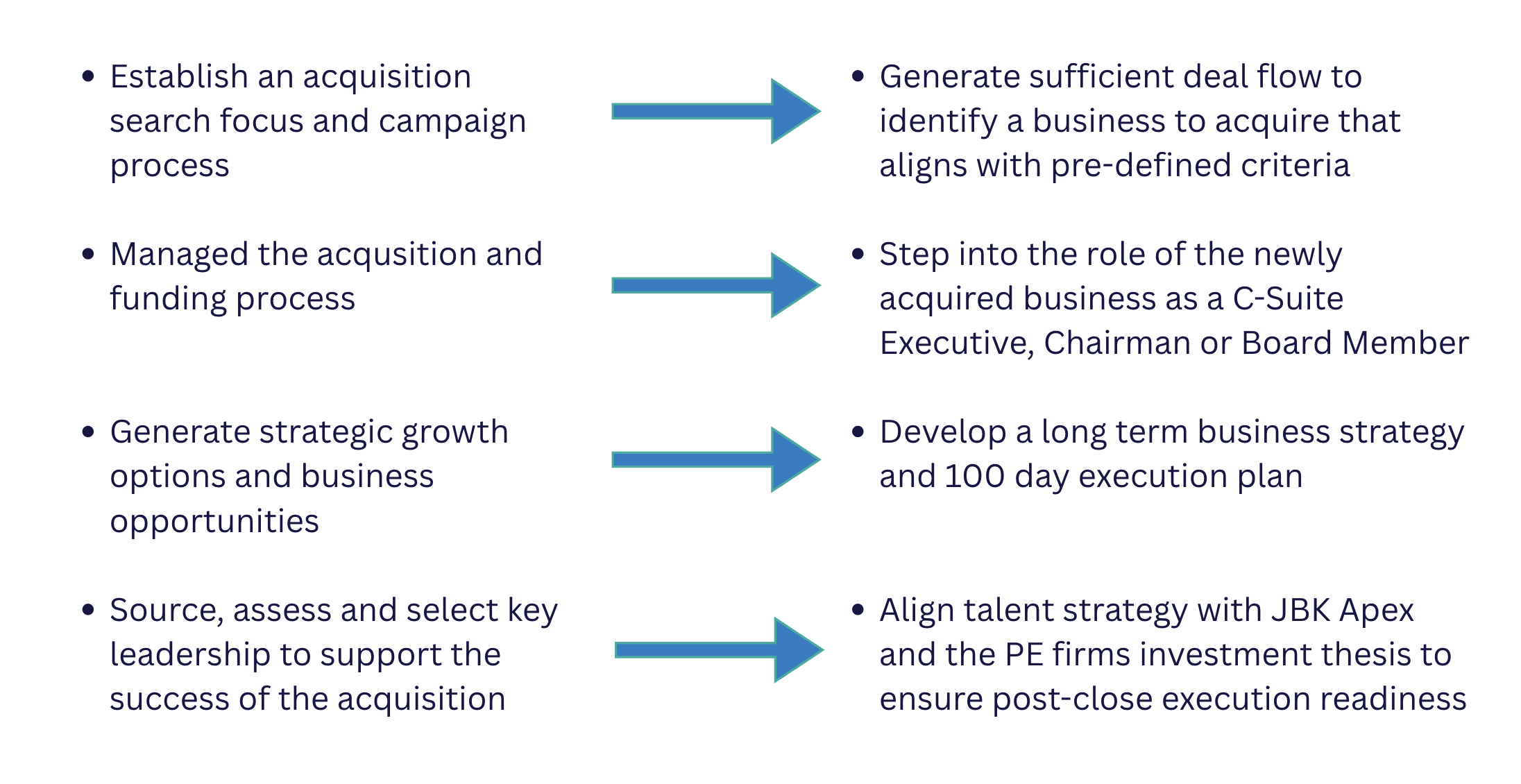 JBK Apex elevates private equity firms’ approach to value creation. By identifying and securing proven, backable CEOs before an acquisition, we enable a more strategic, insight-driven entry point into new investments.